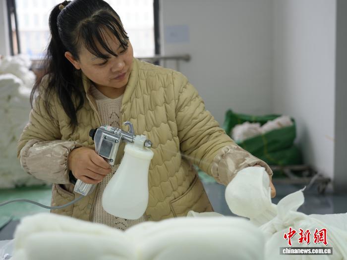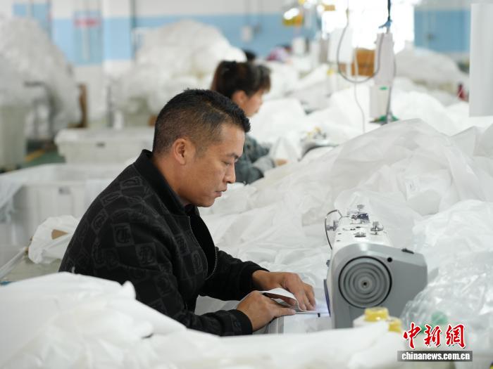 图为3月31日,工人正在消费线上用缝纫机缝造车衣。石小杰 摄
